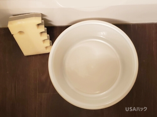 お風呂の掃除はさきほどのベーキングパウダー(重曹)で行なっています。しかし多くのアメリカの家がそうであるように、うちもシャワーヘッドが動きません。つまり洗っても汚れがうまく流れない。ということで近くの日系ストアで桶を買ってきました。この桶でシャワーが届かない部分の汚れを流しています。シミ抜きでブリーチにつけおく時にも使えますよ。