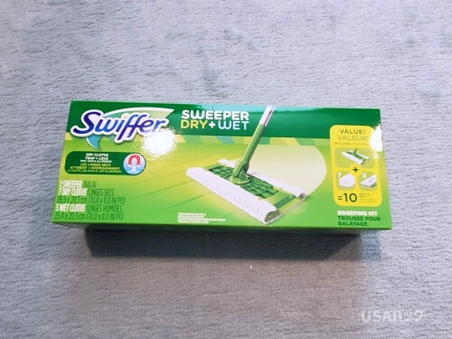 私が使っているのはSwifferのSweepr。写真はスターターキットの箱です。本体とドライシート7枚、ウェットシート3枚が入っていました。アメリカの商品には慣れておらず想像と違った…ということも多いのでこういうお試しセットを積極的に使うようにしています。