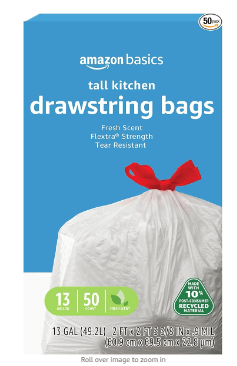 キッチンにおいてある一番大きなゴミ箱(肉のトレーやパンが入っていた袋などかさばるものを捨てる用途)には一般的な13ガロンのものを使用しています。これは以前からAmazonのPBで大容量のものを買っています。こういう巾着みたいになっているアメリカのゴミ袋が好きです。